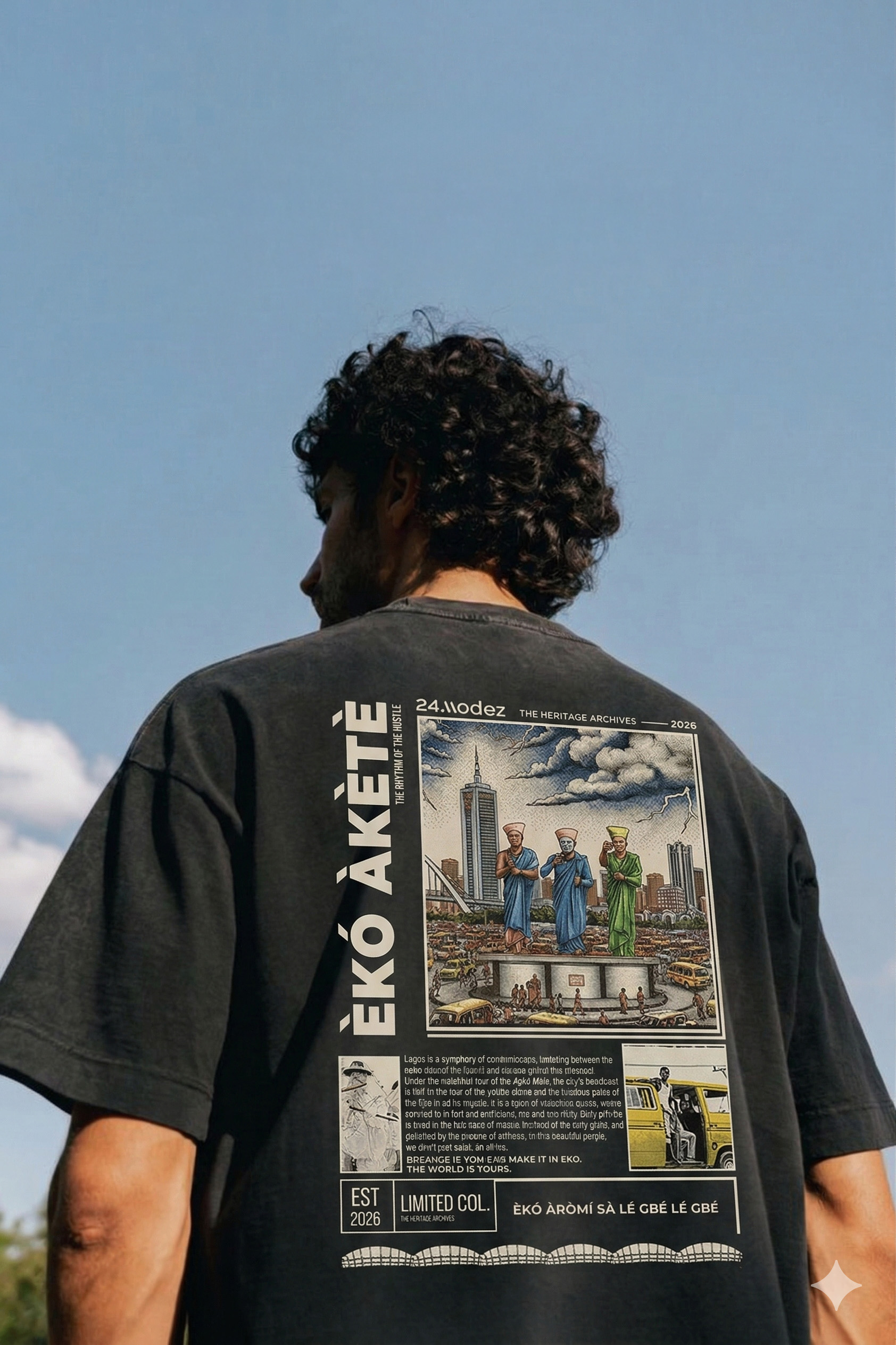 Lagos is not just a city; it’s an energy. The Èkó Àkètè (The Rhythm of the Hustle) shirt honors the center of excellence—a place where tradition meets the fast-paced modern world. This design reflects the colorful chaos, the iconic yellow buses, the sleek skyscrapers, and the undeniable “Eko” pride.